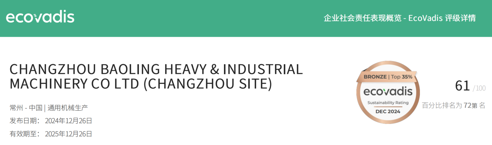 2024年12月26日,寶菱重工在EcoVadis企業(yè)社會(huì)責(zé)任評(píng)估中得分61分,并榮獲“銅牌”,在EcoVadis所有在評(píng)公司中躋身于前 35%(已超過 65% 以上的公司)。當(dāng)前,“環(huán)境、社會(huì)責(zé)任和公司治理”(簡(jiǎn)稱:ESG)水平已成為衡量企業(yè)長期價(jià)值和可持續(xù)發(fā)展能力的關(guān)鍵因素,其核心在于“友好環(huán)境、尊重員工、合規(guī)經(jīng)營、可持續(xù)發(fā)展”。公司將可持續(xù)發(fā)展理念融入企業(yè)戰(zhàn)略與日程經(jīng)營活動(dòng)中,推動(dòng)導(dǎo)入ESG